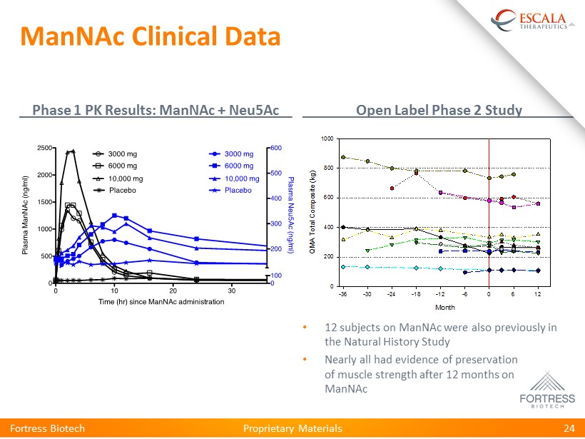 Proprietary Materials Month -36 -30 -24 -18 -12 -6 0 6 12 QMA Total Composite (kg) 0 200 400 600 800 1000 ManNAc Clinical Data Phase 1 PK Results: ManNAc + Neu5Ac Open Label Phase 2 Study Fortress Biotech 24 • 12 subjects on ManNAc were also previously in the Natural History Study • Nearly all had evidence of preservation of muscle strength after 12 months on ManNAc