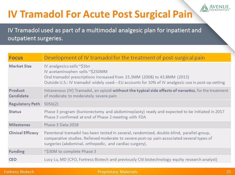 Proprietary Materials Proprietary Materials Fortress Biotech 25 Focus Development of IV tramadol for the treatment of post - surgical pain Market Size IV analgesics sells ~$1bn IV acetaminophen sells ~$250MM Oral tramadol prescriptions increased from 23.3MM (2008) to 43.8MM (2013) Outside U.S.: IV tramadol widely used --- EU accounts for 10% of IV analgesic use in post - op setting Product Candidate Intravenous (IV) Tramadol, an opioid without the typical side effects of narcotics , for the treatment of moderate to moderately severe pain Regulatory Path 505b(2) Status Phase 3 program (bunionectomy and abdominoplasty) ready and expected to be initiated in 2017 Phase 3 confirmed at end of Phase 2 meeting with FDA Milestones Phase 3 Data 2018 Clinical Efficacy Parenteral tramadol has been tested in several, randomized, double - blind, parallel - group, comparative studies. Relieved moderate to severe post - op pain associated several types of surgeries (abdominal, orthopedic, and cardiac surgery). Funding ~$30M to complete Phase 3 CEO Lucy Lu, MD (CFO, Fortress Biotech and previously Citi biotechnology equity research analyst) IV Tramadol For Acute Post Surgical Pain IV Tramadol used as part of a multimodal analgesic plan for inpatient and outpatient surgeries.