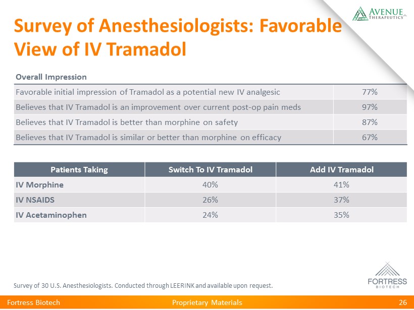Proprietary Materials Survey of Anesthesiologists: Favorable View of IV Tramadol Survey of 30 U.S. Anesthesiologists. Conducted through LEERINK and available upon request. Fortress Biotech 26 Patients Taking Switch To IV Tramadol Add IV Tramadol IV Morphine 40% 41% IV NSAIDS 26% 37% IV Acetaminophen 24% 35% Overall Impression Favorable initial impression of Tramadol as a potential new IV analgesic 77% Believes that IV Tramadol is an improvement over current post - op pain meds 97% Believes that IV Tramadol is better than morphine on safety 87% Believes that IV Tramadol is similar or better than morphine on efficacy 67%