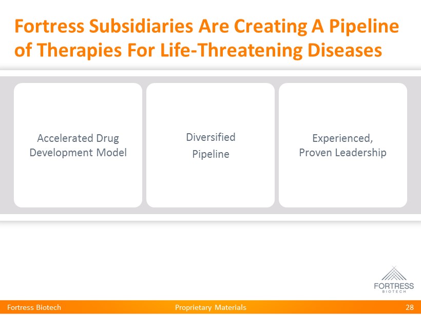 Proprietary Materials Accelerated Drug Development Model Fortress Subsidiaries Are Creating A Pipeline of Therapies For Life - Threatening Diseases Fortress Biotech 28 Diversified Pipeline Experienced, Proven Leadership
