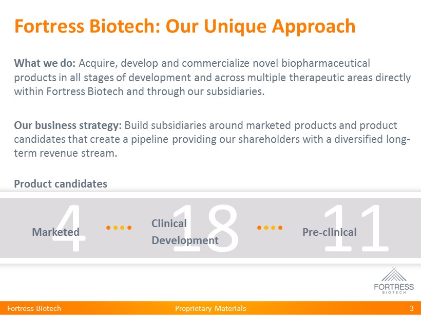 Proprietary Materials Forward Looking Statements This presentation may contain “forward - looking statements” within the meaning of Section 27A of the Securities Act of 1933 and Section 21E of the Securities Exchange Act of 1934. Such statements include, but are not limited to, any statements relating to our growth strategy and product development programs and any other statements that are not historical facts. Forward - looking statements are based on management’s current expectations and are subject to risks and uncertainties that could negatively affect our business, operating results, financial condition and stock price. Factors that could cause actual results to differ materially from those currently anticipated include: risks related to our growth strategy; risks relating to the results of research and development activities; our ability to obtain, perform under and maintain financing and strategic agreements and relationships; uncertainties relating to preclinical and clinical testing; our dependence on third party suppliers; our ability to attract, integrate, and retain key personnel; the early stage of products under development; our need for and continued access to additional funds; government regulation; patent and intellectual property matters; competition; as well as other risks described in our SEC filings. We expressly disclaim any obligation or undertaking to release publicly any updates or revisions to any forward looking statements contained herein to reflect any change in our expectations or any changes in events, conditions or circumstances on which any such statement is based, except as may be required by law. Fortress Biotech 2