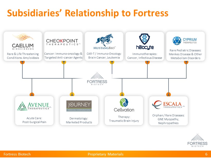 Proprietary Materials Subsidiaries’ Relationship to Fortress Fortress Biotech 6 Rare & Life Threatening Conditions: Amyloidosis Rare Pediatric Diseases: Menkes Disease & Other Metabolism Disorders Cancer: Immuno - oncology & Targeted Anti - cancer Agents CAR - T / Immuno - Oncology: Brain Cancer, Leukemia Acute Care: Post - Surgical Pain Immunotherapies: Cancer, Infectious Disease Orphan / Rare Diseases: GNE Myopathy, Nephropathies Dermatology : Marketed Products Therapy : Traumatic Brain Injury