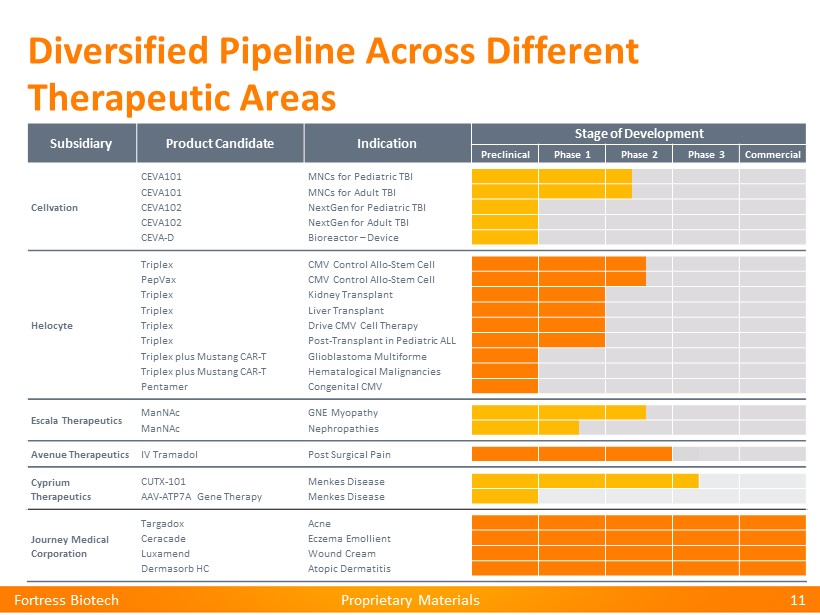 Proprietary Materials Hematology / Oncology Pipeline Subsidiary Product Candidate Indication Stage of Development Preclinical Phase 1 Phase 2 Phase 3 Commercial Caelum Biosciences CAEL - 101 AL Amyloidosis Checkpoint Therapeutics Anti - PD - L1 Solid Tumor Anti - GITR Anti - CAIX CK - 101 EGFR Inhibitor CK - 102 PARP Inhibitor CK - 103 BET Inhibitor Mustang Bio MB - 101 IL13R α 2 - specific CAR Malignant Glioma MB - 102 CD123 CAR AML; BPDCN Fortress Biotech CNDO - 109 AML; MDS 10 Fortress Biotech