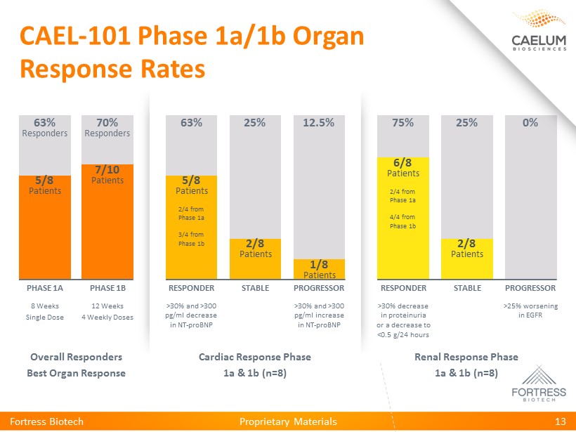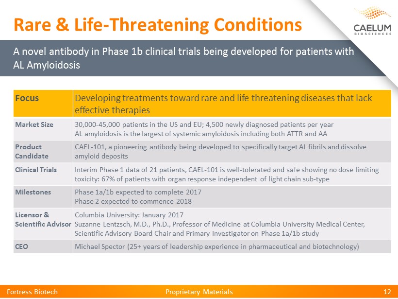 Proprietary Materials Proprietary Materials Fortress Biotech 12 Focus Developing treatments toward rare and life threatening diseases that lack effective therapies Market Size 30,000 - 45,000 patients in the US and EU; 4,500 newly diagnosed patients per year AL amyloidosis is the largest of systemic amyloidosis including both ATTR and AA Product Candidate CAEL - 101, a pioneering antibody being developed to specifically target AL fibrils and dissolve amyloid deposits Clinical Trials Interim Phase 1 data of 21 patients, CAEL - 101 is well - tolerated and safe showing no dose limiting toxicity: 67 % of patients with organ response independent of light chain sub - type Milestones Phase 1a/1b expected to complete 2017 Phase 2 expected to commence 2018 Licensor & Scientific Advisor Columbia University: January 2017 Suzanne Lentzsch, M.D., Ph.D., Professor of Medicine at Columbia University Medical Center, Scientific Advisory Board Chair and Primary Investigator on Phase 1a/1b study CEO Michael Spector (25+ years of leadership experience in pharmaceutical and biotechnology) A novel antibody in Phase 1b clinical trials being developed for patients with AL Amyloidosis Rare & Life - Threatening Conditions