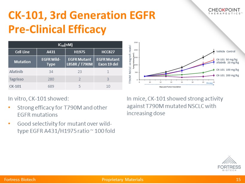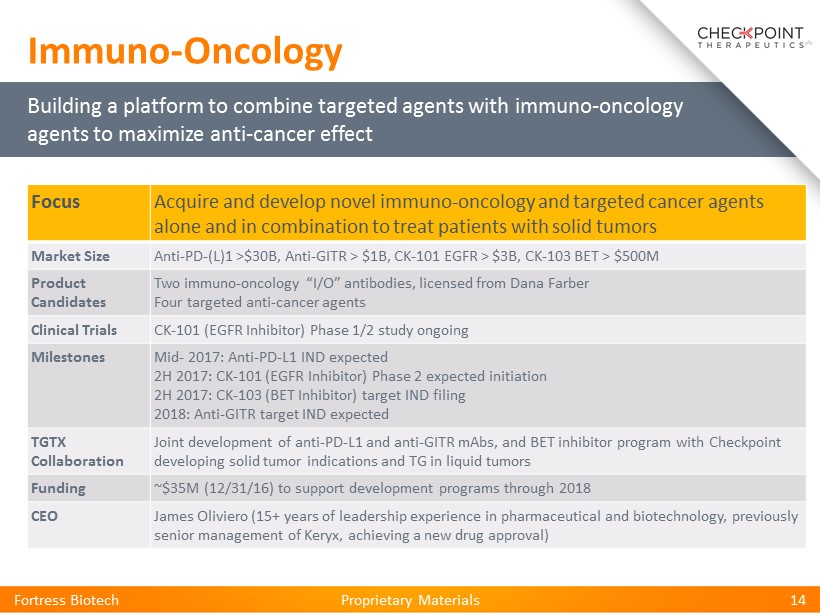 Proprietary Materials Proprietary Materials Fortress Biotech 14 Focus Acquire and develop novel immuno - oncology and targeted cancer agents alone and in combination to treat patients with solid tumors Market Size Anti - PD - (L)1 >$30B, Anti - GITR > $1B, CK - 101 EGFR > $3B, CK - 103 BET > $500M Product Candidates Two immuno - oncology “I/O” antibodies, licensed from Dana Farber Four targeted anti - cancer agents Clinical Trials CK - 101 (EGFR Inhibitor) Phase 1/2 study ongoing Milestones Mid - 2017: Anti - PD - L1 IND expected 2H 2017: CK - 101 (EGFR Inhibitor) Phase 2 expected initiation 2H 2017: CK - 103 (BET Inhibitor) target IND filing 2018 : Anti - GITR target IND expected TGTX Collaboration Joint development of anti - PD - L1 and anti - GITR mAbs , and BET inhibitor program with Checkpoint developing solid tumor indications and TG in liquid tumors Funding ~$35M (12/31/16 ) to support development programs through 2018 CEO James Oliviero (15+ years of leadership experience in pharmaceutical and biotechnology, previously senior management of Keryx , achieving a new drug approval) Building a platform to combine targeted agents with immuno - oncology agents to maximize anti - cancer effect Immuno - Oncology