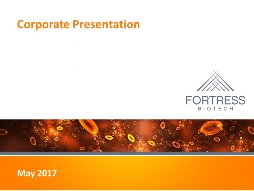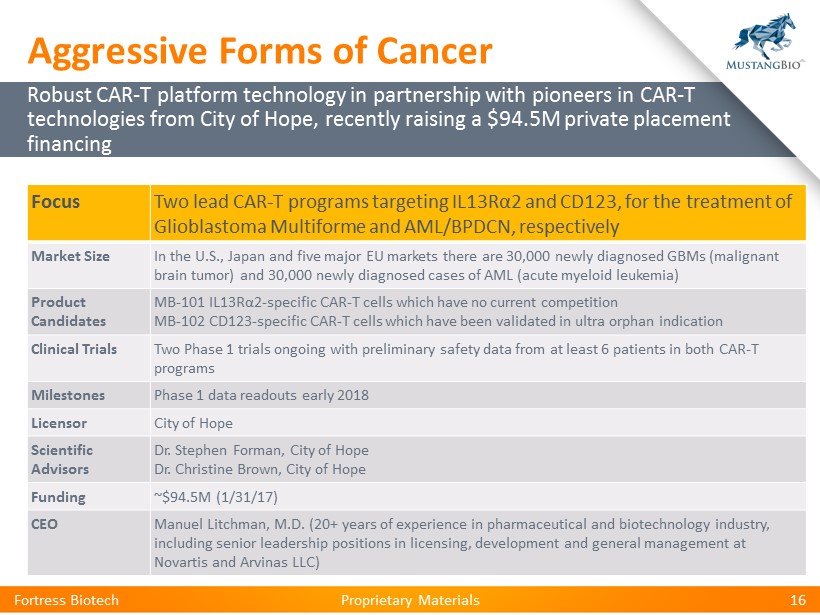 Proprietary Materials Proprietary Materials Focus Two lead CAR - T programs targeting IL13R α 2 and CD123, for the treatment of Glioblastoma Multiforme and AML/BPDCN, respectively Market Size In U.S., Japan and five major EU markets per year… ~30,000 newly diagnosed GBMs (malignant brain tumor) ~30,000 newly diagnosed cases of AML (acute myeloid leukemia) Product Candidates MB - 101 IL13R α 2 - specific CAR - T cells which have no current competition MB - 102 CD123 - specific CAR - T cells which have been validated in ultra orphan indication Clinical Trials Two Phase 1 trials ongoing with preliminary safety data from at least 6 patients in both CAR - T programs Milestones Phase 1 data readouts early 2018 NEJM case study demonstrates MB - 101 achieved complete remission in patient with recurrent GBM Licensor City of Hope Scientific Advisors Dr. Stephen Forman, City of Hope Dr. Christine Brown, City of Hope Focus Two lead CAR - T programs targeting IL13R α 2 and CD123, for the treatment of Glioblastoma Multiforme and AML/BPDCN, respectively Market Size In the U.S ., Japan and five major EU markets there are 30,000 newly diagnosed GBMs (malignant brain tumor ) and 30,000 newly diagnosed cases of AML (acute myeloid leukemia ) Product Candidates MB - 101 IL13R α 2 - specific CAR - T cells which have no current competition MB - 102 CD123 - specific CAR - T cells which have been validated in ultra orphan indication Clinical Trials Two Phase 1 trials ongoing with preliminary safety data from at least 6 patients in both CAR - T programs Milestones Phase 1 data readouts early 2018 Licensor City of Hope Scientific Advisors Dr. Stephen Forman, City of Hope Dr. Christine Brown, City of Hope Funding ~$94.5M (1/31/17) CEO Manuel Litchman , M.D. (20+ years of experience in pharmaceutical and biotechnology industry, including senior leadership positions in licensing, development and general management at Novartis and Arvinas LLC) Fortress Biotech 16 Robust CAR - T platform technology in partnership with pioneers in CAR - T technologies from City of Hope, recently raising a $94.5M private placement financing Aggressive Forms of Cancer