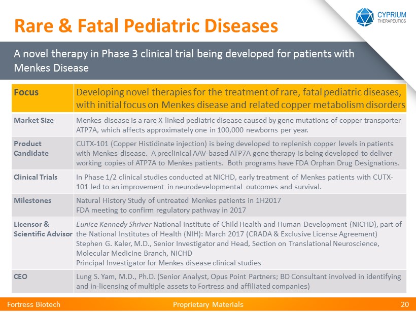 Proprietary Materials Proprietary Materials Fortress Biotech 20 Focus Developing novel therapies for the treatment of rare, fatal pediatric diseases, with initial focus on Menkes disease and related copper metabolism disorders Market Size Menkes disease is a rare X - linked pediatric disease caused by gene mutations of copper transporter ATP7A, which affects approximately one in 100,000 newborns per year. Product Candidate CUTX - 101 (Copper Histidinate injection) is being developed to replenish copper levels in patients with Menkes disease. A preclinical AAV - based ATP7A gene therapy is being developed to deliver working copies of ATP7A to Menkes patients. Both programs have FDA Orphan Drug Designations. Clinical Trials In Phase 1/2 clinical studies conducted at NICHD, early treatment of Menkes patients with CUTX - 101 led to an improvement in neurodevelopmental outcomes and survival. Milestones Natural History Study of untreated Menkes patients in 1H2017 FDA meeting to confirm regulatory pathway in 2017 Licensor & Scientific Advisor Eunice Kennedy Shriver National Institute of Child Health and Human Development (NICHD), part of the National Institutes of Health (NIH): March 2017 (CRADA & Exclusive License Agreement) Stephen G. Kaler, M.D., Senior Investigator and Head, Section on Translational Neuroscience, Molecular Medicine Branch, NICHD Principal Investigator for Menkes disease clinical studies CEO Lung S. Yam, M.D., Ph.D. (Senior Analyst, Opus Point Partners; BD Consultant involved in identifying and in - licensing of multiple assets to Fortress and affiliated companies) A novel therapy in Phase 3 clinical trial being developed for patients with AL Menkes Disease Rare & Fatal Pediatric Diseases