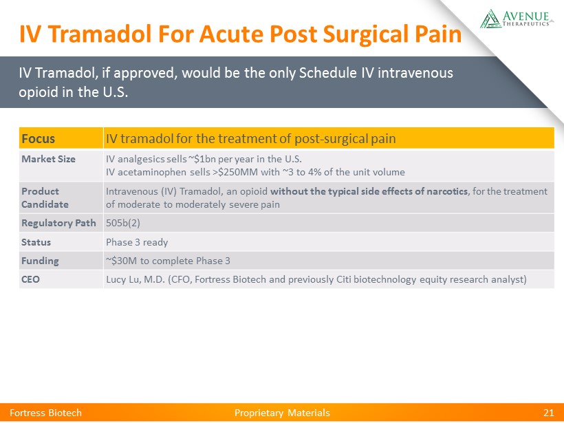 Proprietary Materials Proprietary Materials Fortress Biotech 21 IV Tramadol For Acute Post Surgical Pain IV Tramadol, if approved, would be the only Schedule IV intravenous opioid in the U.S. Focus IV tramadol for the treatment of post - surgical pain Market Size IV analgesics sells ~$ 1bn per year in the U.S. IV acetaminophen sells >$250MM with ~3 to 4% of the unit volume Product Candidate Intravenous (IV) Tramadol, an opioid without the typical side effects of narcotics , for the treatment of moderate to moderately severe pain Regulatory Path 505b(2) Status Phase 3 ready Funding ~$30M to complete Phase 3 CEO Lucy Lu, M.D. (CFO, Fortress Biotech and previously Citi biotechnology equity research analyst)