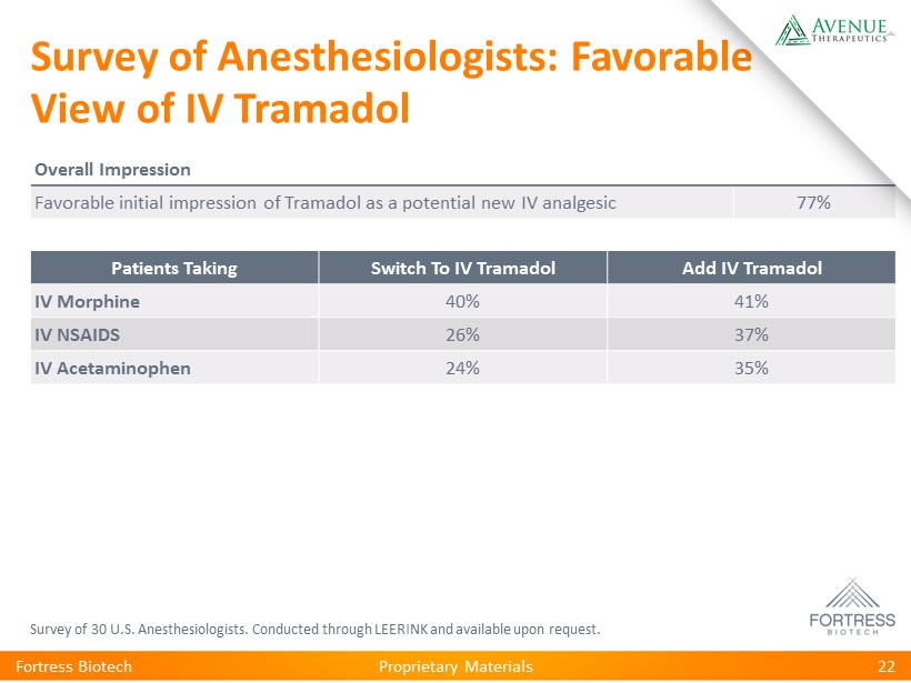 Proprietary Materials Survey of Anesthesiologists: Favorable View of IV Tramadol Survey of 30 U.S. Anesthesiologists. Conducted through LEERINK and available upon request. Fortress Biotech 22 Patients Taking Switch To IV Tramadol Add IV Tramadol IV Morphine 40% 41% IV NSAIDS 26% 37% IV Acetaminophen 24% 35% Overall Impression Favorable initial impression of Tramadol as a potential new IV analgesic 77%