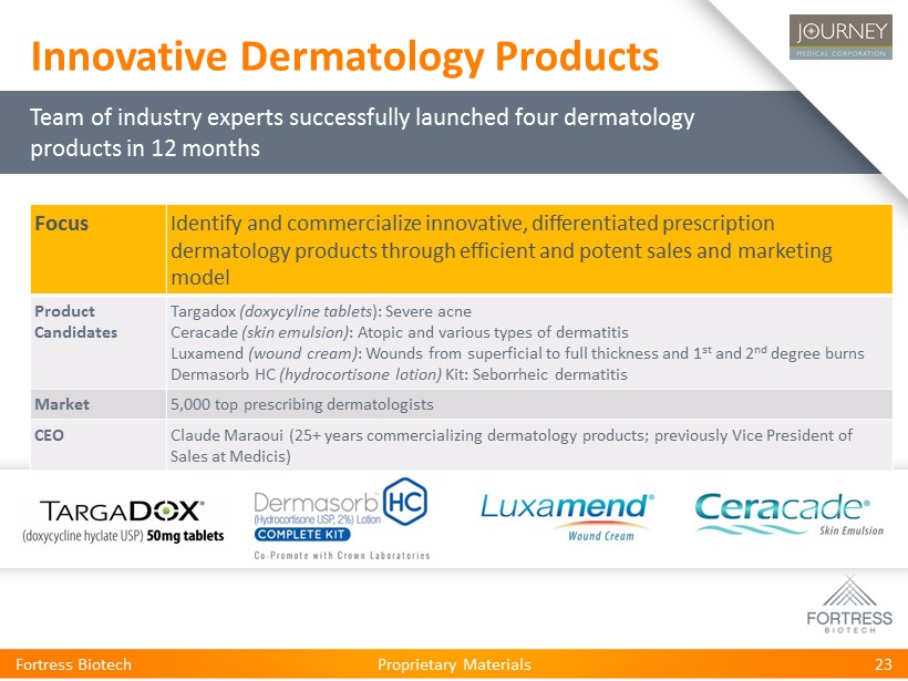 Proprietary Materials Fortress Biotech 23 Focus Identify and commercialize innovative, differentiated prescription dermatology products through efficient and potent sales and marketing model Product Candidates Targadox ( doxycyline tablets ) : Sever e acne Ceracade (skin emulsion) : Atopic and various types of dermatitis Luxamend (wound cream) : Wounds from superficial to full thickness and 1 st and 2 nd degree burns Dermasorb HC (hydrocortisone lotion) Kit: Seborrheic dermatitis Market 5 ,000 top prescribing dermatologists CEO Claude Maraoui (25+ years commercializing dermatology products; previously Vice President of Sales at Medicis ) Team of industry experts successfully launched four dermatology products in 12 months Innovative Dermatology Products