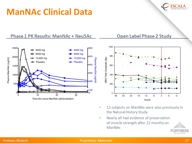 Proprietary Materials ManNAc Clinical Data Phase 1 PK Results: ManNAc + Neu5Ac Open Label Phase 2 Study Fortress Biotech 27 • 12 subjects on ManNAc were also previously in the Natural History Study • Nearly all had evidence of preservation of muscle strength after 12 months on ManNAc Proprietary Materials Month -36 -30 -24 -18 -12 -6 0 6 12 Q M A T o t a l C o m p o s i t e ( k g ) 0 200 400 600 800 1000 ManNAc Clinical Data Phase 1 PK Results: ManNAc + Neu5Ac Open Label Phase 2 Study Fortress Biotech 24 • 12 subjects on ManNAc were also previously in the Natural History Study • Nearly all had evidence of preservation of muscle strength after 12 months on ManNAc