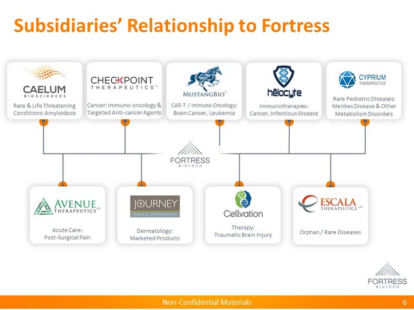 Non - Confidential Materials Experienced Leadership 5 • Co - Portfolio Manager and Partner of Opus Point Partners, LLC • Prolific and successful investor in the life sciences industry for over 20 years previously as Chairman of Paramount BioCapital Lindsay A. Rosenwald, MD President and CEO Chairman of the Board • Executive Chairman and CEO of TG Therapeutics • Co - Portfolio Manager and Partner of Opus Point Partners, LLC • Previously Chairman and CEO of Keryx Biopharmaceuticals Michael S. Weiss Executive Vice Chairman Co - Vice Chairman of the Board • Currently serves on board of Biogen, Inc. • Oncologist and former Chief Medical Officer at ImClone Systems, Inc. • Advisor to academic, industrial and FDA advisory boards and has more than 300 peer - reviewed publications Eric K. Rowinsky, MD Co - Vice Chairman of the Board • Vice President and Corporate Controller of Fortress Biotech from June 2011 until June 2017 • Former Senior Vice President and CFO of Schochet Associates, as well as Corporate Controller of Indevus Pharmaceuticals • Over 30 years of financial and operational experience Robyn Hunter Chief Financial Officer • Former Divisional VP, Global Process and Manufacturing Sciences, Abbvie • Over 30 years experience in biopharmaceutical process development including leading Humira’s™ process and manufacturing, world’s biggest selling pharmaceutical product George C. Avgerinos, PhD Senior Vice President, Operations