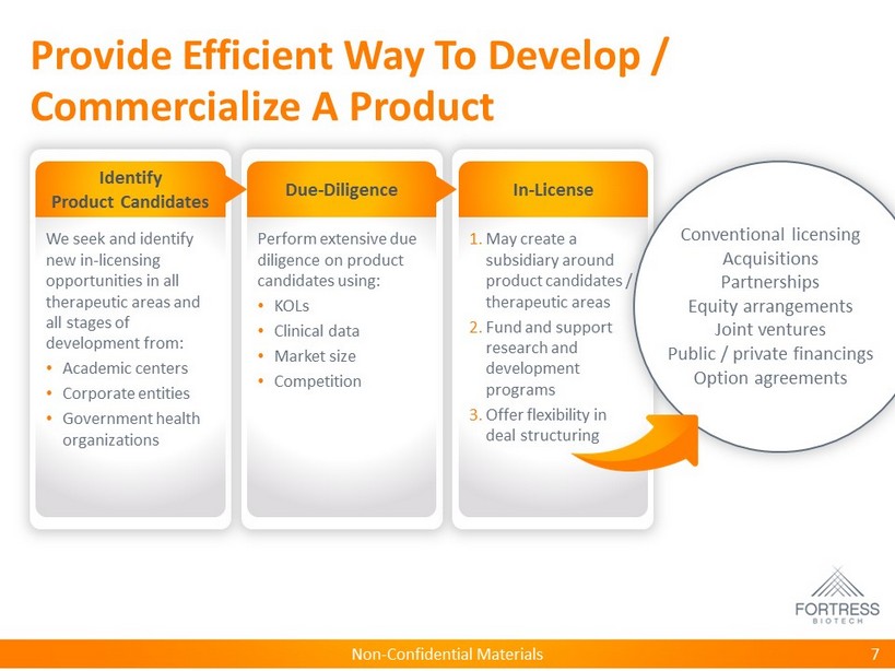 Non - Confidential Materials Subsidiaries’ Relationship to Fortress 6 Rare & Life Threatening Conditions: Amyloidosis Rare Pediatric Diseases: Menkes Disease & Other Metabolism Disorders Cancer: Immuno - oncology & Targeted Anti - cancer Agents CAR - T / Immuno - Oncology: Brain Cancer, Leukemia Acute Care: Post - Surgical Pain Immunotherapies: Cancer, Infectious Disease Orphan / Rare Diseases Dermatology: Marketed Products Therapy: Traumatic Brain Injury