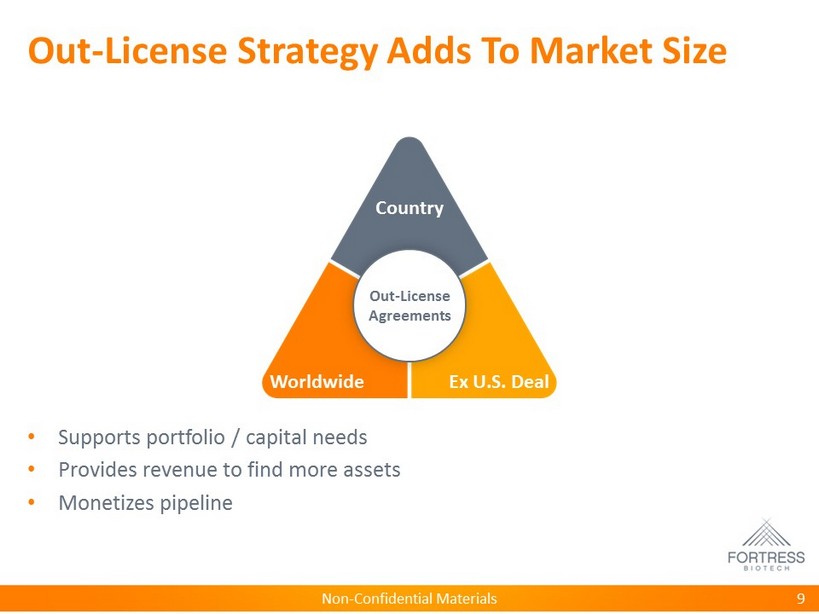 Non - Confidential Materials Fortress: Offer Subsidiaries Accelerated Drug Development 8 Scientific Affairs SUBSIDIARY 1. Expertise in each therapeutic area 2. Knowledge of the development process 3. Pooled resources 4. Cost efficient operations structure 5. Top - tier focused management team 6. Access to capital Funding & Management Services Business Development Finance Scientific Affairs Legal Accounting Clinical Trials Manufacturing Executive Chairman / Board
