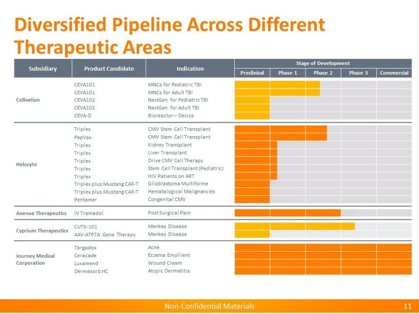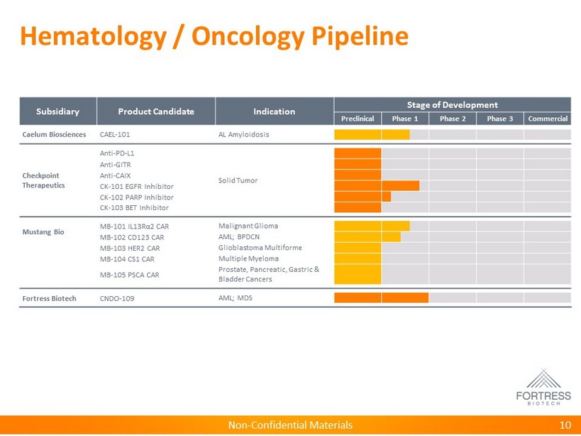 Non - Confidential Materials Hematology / Oncology Pipeline Subsidiary Product Candidate Indication Stage of Development Preclinical Phase 1 Phase 2 Phase 3 Commercial Caelum Biosciences CAEL - 101 AL Amyloidosis Checkpoint Therapeutics Anti - PD - L1 Solid Tumor Anti - GITR Anti - CAIX CK - 101 EGFR Inhibitor CK - 102 PARP Inhibitor CK - 103 BET Inhibitor Mustang Bio MB - 101 IL13R α 2 CAR Malignant Glioma MB - 102 CD123 CAR AML; BPDCN MB - 103 HER2 CAR Glioblastoma Multiforme MB - 104 CS1 CAR Multiple Myeloma MB - 105 PSCA CAR Prostate, Pancreatic, Gastric & Bladder Cancers Fortress Biotech CNDO - 109 AML; MDS 10