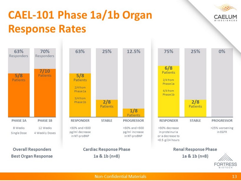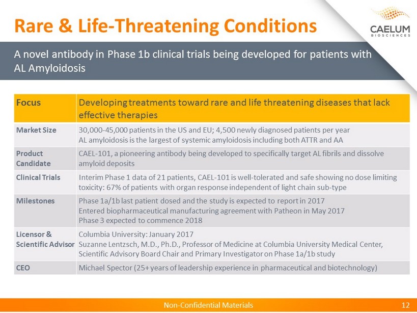 Non - Confidential Materials Non - Confidential Materials 12 Focus Developing treatments toward rare and life threatening diseases that lack effective therapies Market Size 30,000 - 45,000 patients in the US and EU; 4,500 newly diagnosed patients per year AL amyloidosis is the largest of systemic amyloidosis including both ATTR and AA Product Candidate CAEL - 101, a pioneering antibody being developed to specifically target AL fibrils and dissolve amyloid deposits Clinical Trials Interim Phase 1 data of 21 patients, CAEL - 101 is well - tolerated and safe showing no dose limiting toxicity: 67 % of patients with organ response independent of light chain sub - type Milestones Phase 1a/1b last patient dosed and the study is expected to report in 2017 Entered biopharmaceutical manufacturing agreement with Patheon in May 2017 Phase 3 expected to commence 2018 Licensor & Scientific Advisor Columbia University: January 2017 Suzanne Lentzsch, M.D., Ph.D., Professor of Medicine at Columbia University Medical Center, Scientific Advisory Board Chair and Primary Investigator on Phase 1a/1b study CEO Michael Spector (25+ years of leadership experience in pharmaceutical and biotechnology) A novel antibody in Phase 1b clinical trials being developed for patients with AL Amyloidosis Rare & Life - Threatening Conditions