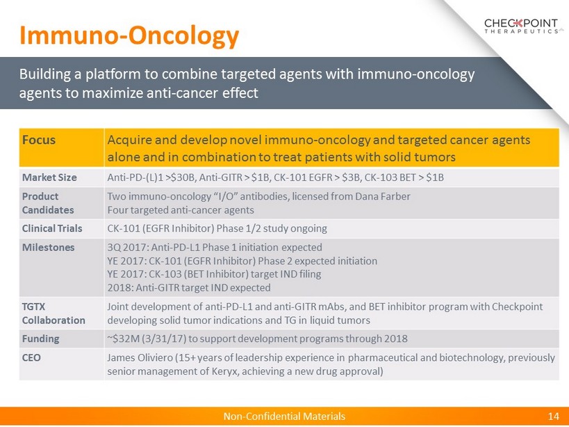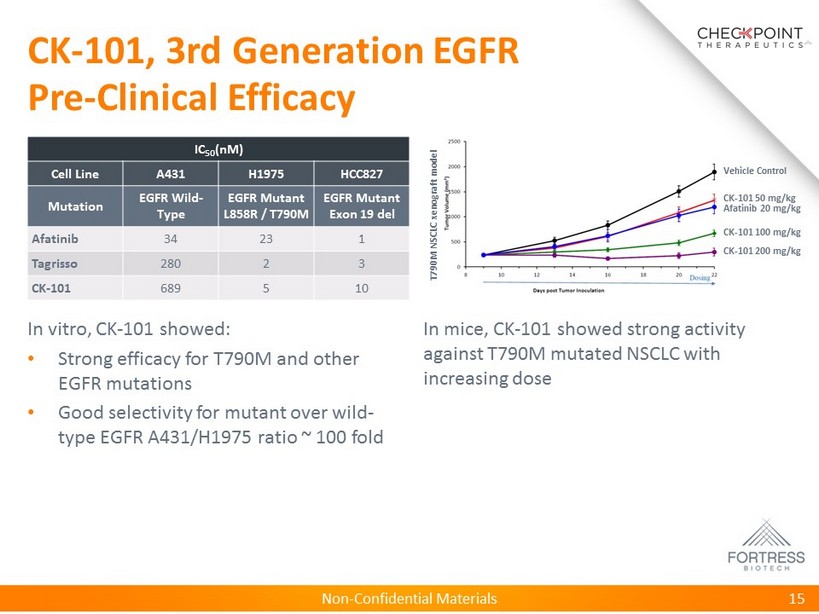 Non - Confidential Materials Non - Confidential Materials 14 Focus Acquire and develop novel immuno - oncology and targeted cancer agents alone and in combination to treat patients with solid tumors Market Size Anti - PD - (L)1 >$30B, Anti - GITR > $1B, CK - 101 EGFR > $3B, CK - 103 BET > $1B Product Candidates Two immuno - oncology “I/O” antibodies, licensed from Dana Farber Four targeted anti - cancer agents Clinical Trials CK - 101 (EGFR Inhibitor) Phase 1/2 study ongoing Milestones 3Q 2017: Anti - PD - L1 Phase 1 initiation expected YE 2017: CK - 101 (EGFR Inhibitor) Phase 2 expected initiation YE 2017: CK - 103 (BET Inhibitor) target IND filing 2018: Anti - GITR target IND expected TGTX Collaboration Joint development of anti - PD - L1 and anti - GITR mAbs, and BET inhibitor program with Checkpoint developing solid tumor indications and TG in liquid tumors Funding ~$32M (3/31/17) to support development programs through 2018 CEO James Oliviero (15+ years of leadership experience in pharmaceutical and biotechnology, previously senior management of Keryx, achieving a new drug approval) Building a platform to combine targeted agents with immuno - oncology agents to maximize anti - cancer effect Immuno - Oncology
