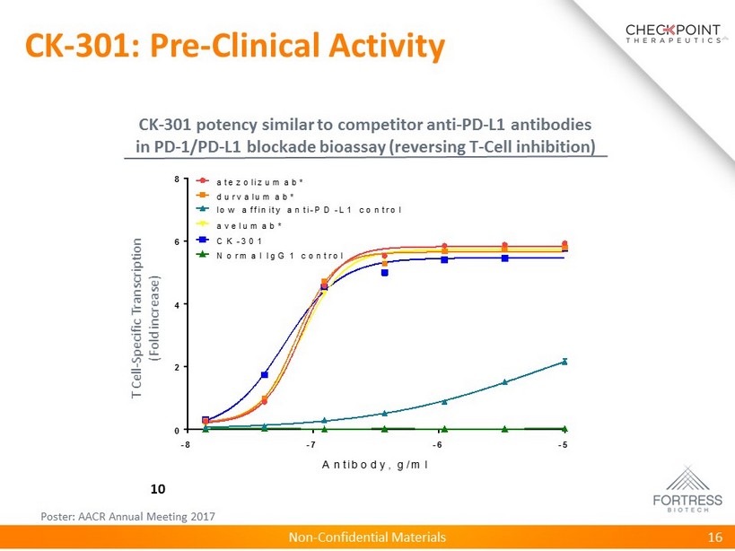 Non - Confidential Materials CK - 301: Pre - Clinical Activity 16 T Cell - Specific Transcription (Fold increase) 10 Poster: AACR Annual Meeting 2017 CK - 301 potency similar to competitor anti - PD - L1 antibodies in PD - 1/PD - L1 blockade bioassay (reversing T - Cell inhibition) -8 -7 -6 -5 0 2 4 6 8 Antibody, g/m l F o l d i n c r e a s e o v e r b c k g r d atezolizum ab* durvalum ab* low affinity anti-P D -L1 control avelum ab* C K -301 N orm al IgG 1 control