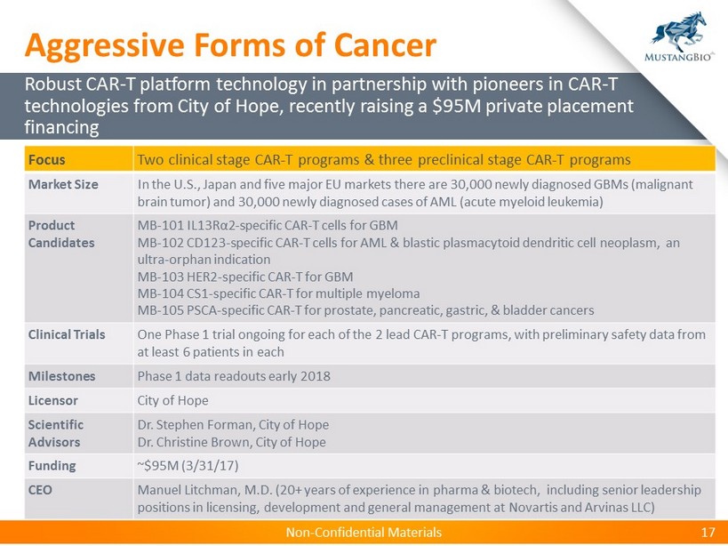 Non - Confidential Materials Non - Confidential Materials Focus Two lead CAR - T programs targeting IL13R α 2 and CD123, for the treatment of Glioblastoma Multiforme and AML/BPDCN, respectively Market Size In U.S., Japan and five major EU markets per year… ~30,000 newly diagnosed GBMs (malignant brain tumor) ~30,000 newly diagnosed cases of AML (acute myeloid leukemia) Product Candidates MB - 101 IL13R α 2 - specific CAR - T cells which have no current competition MB - 102 CD123 - specific CAR - T cells which have been validated in ultra orphan indication Clinical Trials Two Phase 1 trials ongoing with preliminary safety data from at least 6 patients in both CAR - T programs Milestones Phase 1 data readouts early 2018 NEJM case study demonstrates MB - 101 achieved complete remission in patient with recurrent GBM Licensor City of Hope Scientific Advisors Dr. Stephen Forman, City of Hope Dr. Christine Brown, City of Hope Focus Two clinical stage CAR - T programs & three preclinical stage CAR - T programs Market Size In the U.S., Japan and five major EU markets there are 30,000 newly diagnosed GBMs (malignant brain tumor) and 30,000 newly diagnosed cases of AML (acute myeloid leukemia) Product Candidates MB - 101 IL13R α 2 - specific CAR - T cells for GBM MB - 102 CD123 - specific CAR - T cells for AML & blastic plasmacytoid dendritic cell neoplasm, an ultra - orphan indication MB - 103 HER2 - specific CAR - T for GBM MB - 104 CS1 - specific CAR - T for multiple myeloma MB - 105 PSCA - specific CAR - T for prostate, pancreatic, gastric, & bladder cancers Clinical Trials One Phase 1 trial ongoing for each of the 2 lead CAR - T programs, with preliminary safety data from at least 6 patients in each Milestones Phase 1 data readouts early 2018 Licensor City of Hope Scientific Advisors Dr. Stephen Forman, City of Hope Dr. Christine Brown, City of Hope Funding ~$95M (3/31/17 ) CEO Manuel Litchman , M.D. (20+ years of experience in pharma & biotech , including senior leadership positions in licensing, development and general management at Novartis and Arvinas LLC) 17 Robust CAR - T platform technology in partnership with pioneers in CAR - T technologies from City of Hope, recently raising a $95M private placement financing Aggressive Forms of Cancer