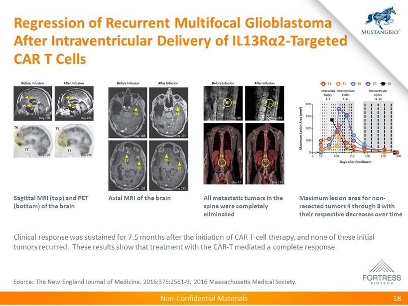 Non - Confidential Materials Regression of Recurrent Multifocal Glioblastoma After Intraventricular Delivery of IL13R α 2 - Targeted CAR T Cells 18 Sagittal MRI (top) and PET (bottom) of the brain Axial MRI of the brain All metastatic tumors in the spine were completely eliminated Maximum lesion area for non - resected tumors 4 through 8 with their respective decreases over time Clinical response was sustained for 7.5 months after the initiation of CAR T - cell therapy, and none of these initial tumors recurred. These results show that treatment with the CAR - T mediated a complete response. Source: The New England Journal of Medicine. 2016;375:2561 - 9. 2016 Massachusetts Medical Society.