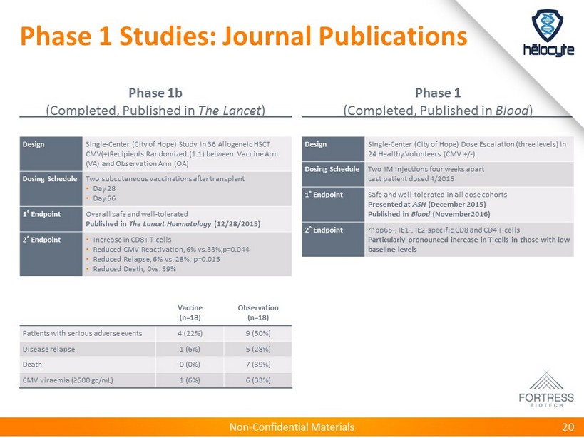 Non - Confidential Materials Phase 1 Studies: Journal Publications Phase 1b (Completed, Published in The Lancet ) Design Single - Center (City of Hope) Study in 36 Allogeneic HSCT CMV(+)Recipients Randomized (1:1) between Vaccine Arm (VA) and Observation Arm (OA) Dosing Schedule Two subcutaneous vaccinations after transplant • Day 28 • Day 56 1˚ Endpoint Overall safe and well - tolerated Published in The Lancet Haematology (12/28/2015) 2˚ Endpoint • Increase in CD8+ T - cells • Reduced CMV Reactivation, 6% vs.33%,p=0.044 • Reduced Relapse, 6% vs. 28%, p=0.015 • Reduced Death, 0vs. 39% Phase 1 (Completed, Published in Blood ) 20 Vaccine (n=18 ) Observation (n=18) Patients with serious adverse events 4 (22%) 9 (50%) Disease relapse 1 (6%) 5 (28%) Death 0 (0%) 7 (39%) CMV viraemia (≥500 gc/mL ) 1 (6%) 6 (33%) Design Single - Center (City of Hope) Dose Escalation (three levels) in 24 Healthy Volunteers (CMV +/ - ) Dosing Schedule Two IM injections four weeks apart Last patient dosed 4/2015 1˚ Endpoint Safe and well - tolerated in all dose cohorts Presented at ASH (December 2015) Published in Blood (November2016) 2˚ Endpoint ↑pp65 - , IE1 - , IE2 - specific CD8 and CD4 T - cells Particularly pronounced increase in T - cells in those with low baseline levels