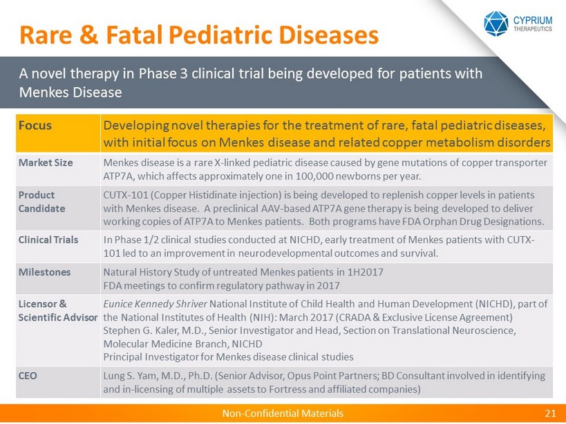 Proprietary Materials Non - Confidential Materials 21 Focus Developing novel therapies for the treatment of rare, fatal pediatric diseases, with initial focus on Menkes disease and related copper metabolism disorders Market Size Menkes disease is a rare X - linked pediatric disease caused by gene mutations of copper transporter ATP7A, which affects approximately one in 100,000 newborns per year. Product Candidate CUTX - 101 (Copper Histidinate injection) is being developed to replenish copper levels in patients with Menkes disease. A preclinical AAV - based ATP7A gene therapy is being developed to deliver working copies of ATP7A to Menkes patients. Both programs have FDA Orphan Drug Designations. Clinical Trials In Phase 1/2 clinical studies conducted at NICHD, early treatment of Menkes patients with CUTX - 101 led to an improvement in neurodevelopmental outcomes and survival. Milestones Natural History Study of untreated Menkes patients in 1H2017 FDA meetings to confirm regulatory pathway in 2017 Licensor & Scientific Advisor Eunice Kennedy Shriver National Institute of Child Health and Human Development (NICHD), part of the National Institutes of Health (NIH): March 2017 (CRADA & Exclusive License Agreement) Stephen G. Kaler, M.D., Senior Investigator and Head, Section on Translational Neuroscience, Molecular Medicine Branch, NICHD Principal Investigator for Menkes disease clinical studies CEO Lung S. Yam, M.D., Ph.D. (Senior Advisor, Opus Point Partners; BD Consultant involved in identifying and in - licensing of multiple assets to Fortress and affiliated companies) A novel therapy in Phase 3 clinical trial being developed for patients with AL Menkes Disease Rare & Fatal Pediatric Diseases