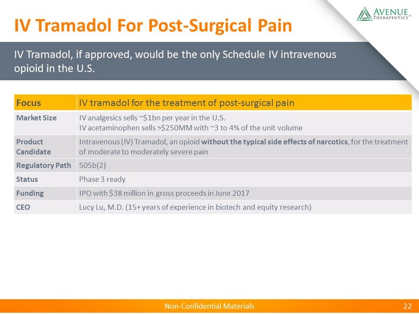 Non - Confidential Materials Non - Confidential Materials 22 IV Tramadol For Post - Surgical Pain IV Tramadol, if approved, would be the only Schedule IV intravenous opioid in the U.S. Focus IV tramadol for the treatment of post - surgical pain Market Size IV analgesics sells ~$1bn per year in the U.S. IV acetaminophen sells >$250MM with ~3 to 4% of the unit volume Product Candidate Intravenous (IV) Tramadol, an opioid without the typical side effects of narcotics , for the treatment of moderate to moderately severe pain Regulatory Path 505b(2) Status Phase 3 ready Funding IPO with $38 million in gross proceeds in June 2017 CEO Lucy Lu, M.D. (15+ years of experience in biotech and equity research)