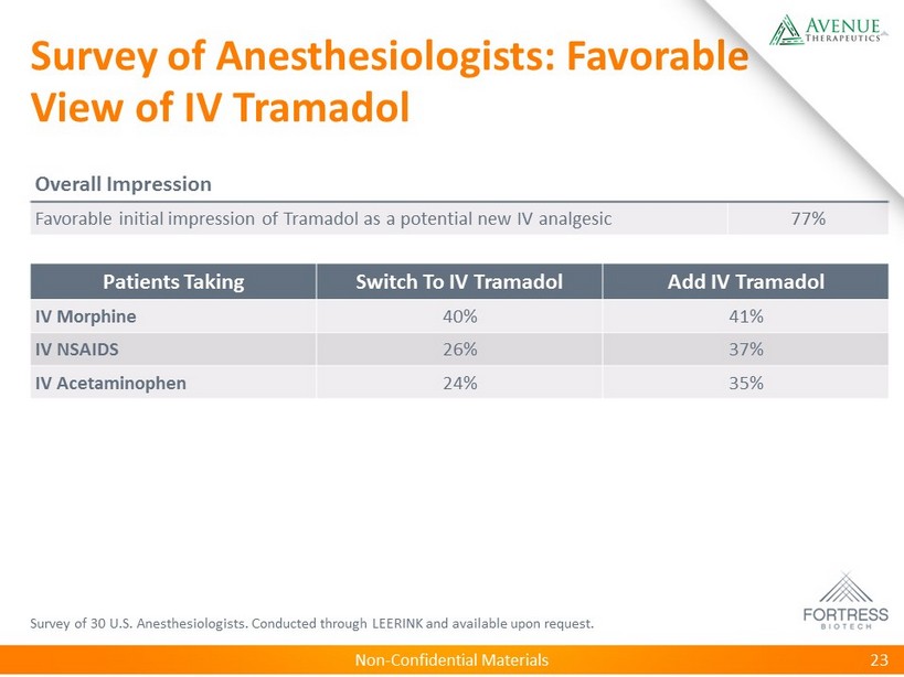 Non - Confidential Materials Survey of Anesthesiologists: Favorable View of IV Tramadol Survey of 30 U.S. Anesthesiologists. Conducted through LEERINK and available upon request. 23 Patients Taking Switch To IV Tramadol Add IV Tramadol IV Morphine 40% 41% IV NSAIDS 26% 37% IV Acetaminophen 24% 35% Overall Impression Favorable initial impression of Tramadol as a potential new IV analgesic 77%