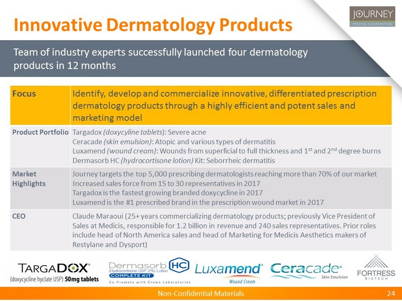 Non - Confidential Materials 24 Focus Identify, develop and commercialize innovative, differentiated prescription dermatology products through a highly efficient and potent sales and marketing model Product Portfolio Targadox ( doxycyline tablets ) : Sever e acne Ceracade (skin emulsion) : Atopic and various types of dermatitis Luxamend (wound cream) : Wounds from superficial to full thickness and 1 st and 2 nd degree burns Dermasorb HC (hydrocortisone lotion) Kit: Seborrheic dermatitis Market Highlights Journey targets the top 5,000 prescribing dermatologists reaching more than 70% of our market Increased sales force from 15 to 30 representatives in 2017 Targadox is the fastest growing branded doxycycline in 2017 Luxamend is the #1 prescribed brand in the prescription wound market in 2017 CEO Claude Maraoui (25+ years commercializing dermatology products; previously Vice President of Sales at Medicis , responsible for 1.2 billion in revenue and 240 sales representatives. Prior roles include head of North America sales and head of Marketing for Medicis Aesthetics makers of Restylane and Dysport ) Team of industry experts successfully launched four dermatology products in 12 months Innovative Dermatology Products