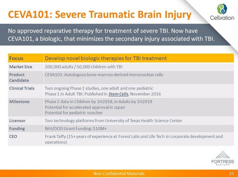 Non - Confidential Materials 25 Focus Develop novel biologic therapies for TBI treatment Market Size 200,000 adults / 50,000 children with TBI Product Candidate CEVA101: Autologous bone - marrow derived mononuclear cells Clinical Trials Two ongoing Phase 2 studies, one adult and one pediatric Phase 1 in Adult TBI: Published in Stem Cells , November 2016 Milestone Phase 2 data in Children by 1H2018, in Adults by 1H2019 Potential for accelerated approval in Japan Potential for pediatric voucher Licensor Two technology platforms from University of Texas Health Science Center Funding NIH/DOD Grant Funding: $10M+ CEO Frank Taffy ( 15+ years of experience at Forest Labs and Life Tech in corporate development and operations) No approved reparative therapy for treatment of severe TBI. Now have CEVA101, a biologic, that minimizes the secondary injury associated with TBI. CEVA101: Severe Traumatic Brain Injury