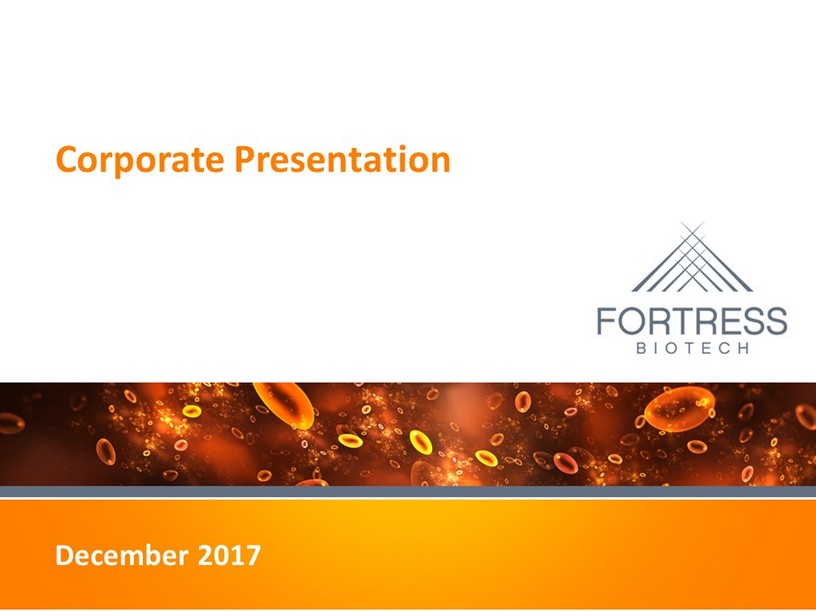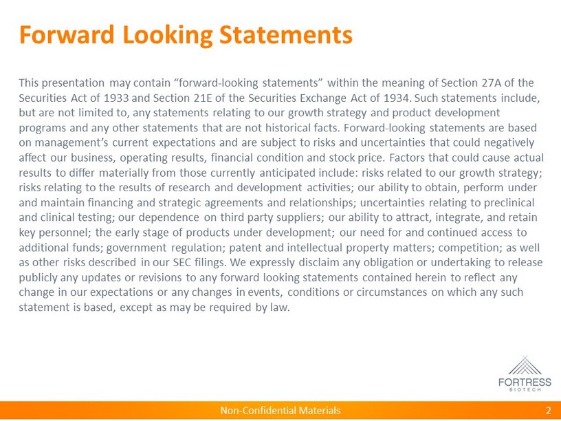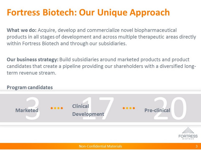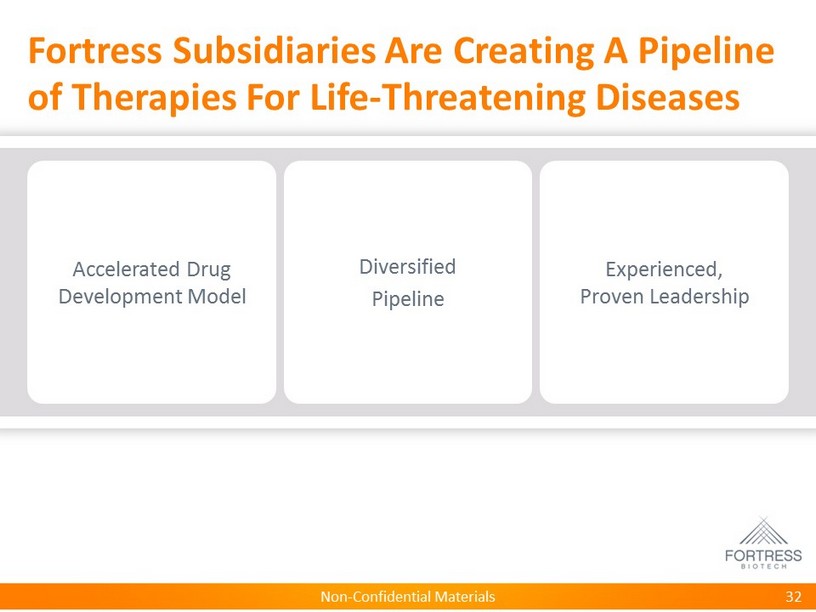 Non - Confidential Materials Accelerated Drug Development Model Fortress Subsidiaries Are Creating A Pipeline of Therapies For Life - Threatening Diseases 32 Diversified Pipeline Experienced, Proven Leadership