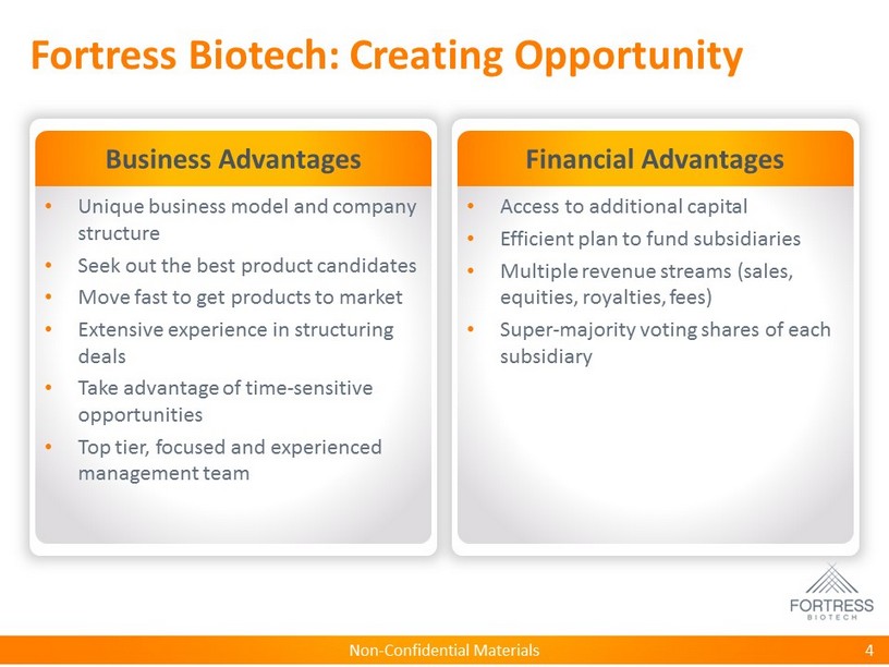 Non - Confidential Materials Fortress Biotech: Our Unique Approach What we do: Acquire, develop and commercialize novel biopharmaceutical products in all stages of development and across multiple therapeutic areas directly within Fortress Biotech and through our subsidiaries. Our business strategy: Build subsidiaries around marketed products and product candidates that create a pipeline providing our shareholders with a diversified long - term revenue stream. Program candidates 3 17 Marketed Clinical Development 20 Pre - clinical 3