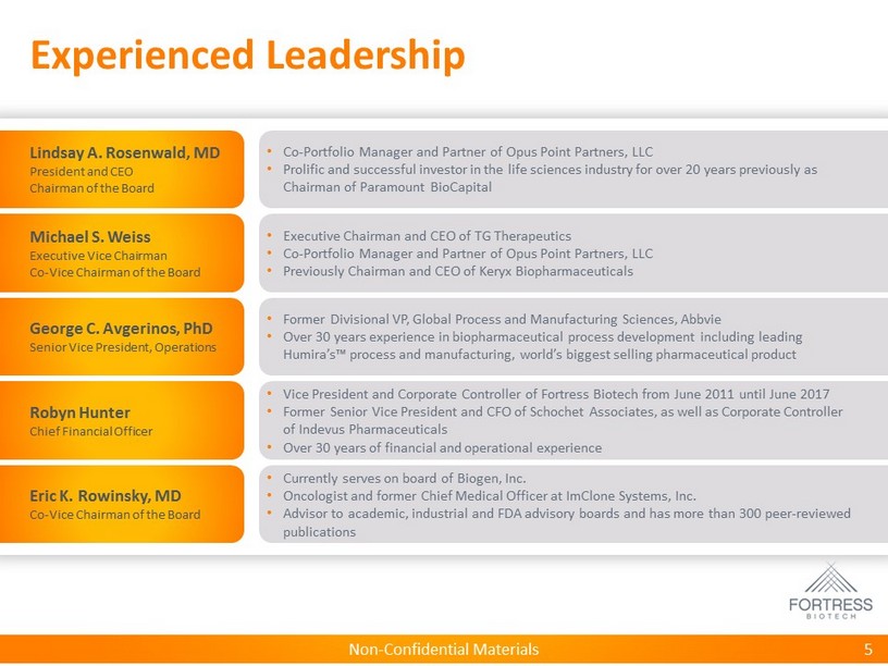 Non - Confidential Materials Fortress Biotech: Creating Opportunity Business Advantages • Unique business model and company structure • Seek out the best product candidates • Move fast to get products to market • Extensive experience in structuring deals • Take advantage of time - sensitive opportunities • Top tier, focused and experienced management team Financial Advantages • Access to additional capital • Efficient plan to fund subsidiaries • Multiple revenue streams (sales, equities, royalties, fees) • Super - majority voting shares of each subsidiary 4