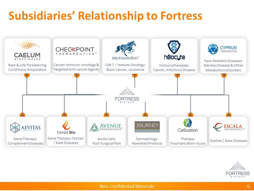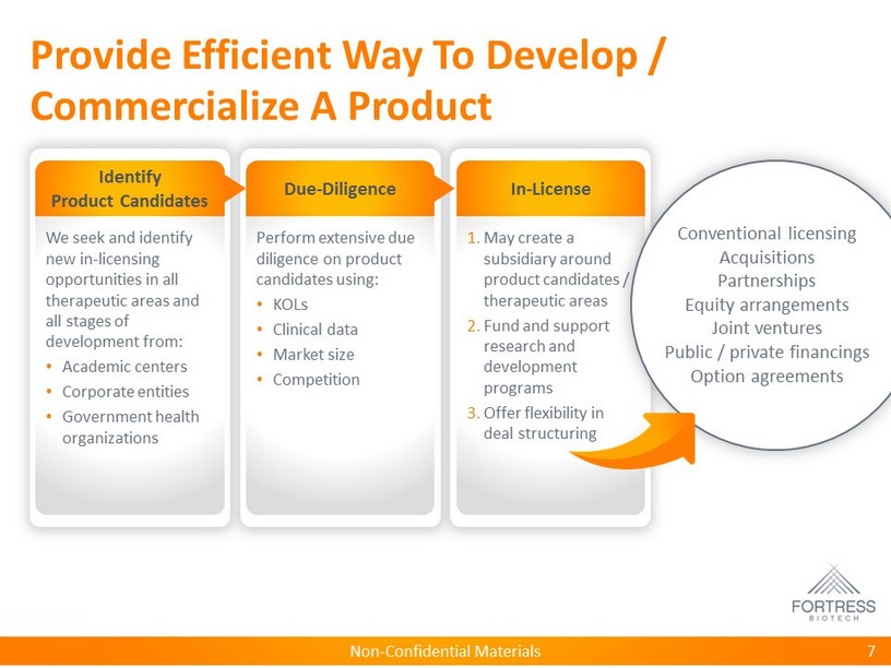 Non - Confidential Materials Subsidiaries’ Relationship to Fortress 6 Rare & Life Threatening Conditions: Amyloidosis Rare Pediatric Diseases: Menkes Disease & Other Metabolism Disorders CAR - T / Immuno - Oncology: Brain Cancer, Leukemia Immunotherapies: Cancer, Infectious Disease Orphan / Rare Diseases Acute Care: Post - Surgical Pain Cancer: Immuno - oncology & Targeted Anti - cancer Agents Dermatology: Marketed Products Therapy: Traumatic Brain Injury Gene Therapy: Complement Diseases Gene Therapy: Orphan / Rare Diseases