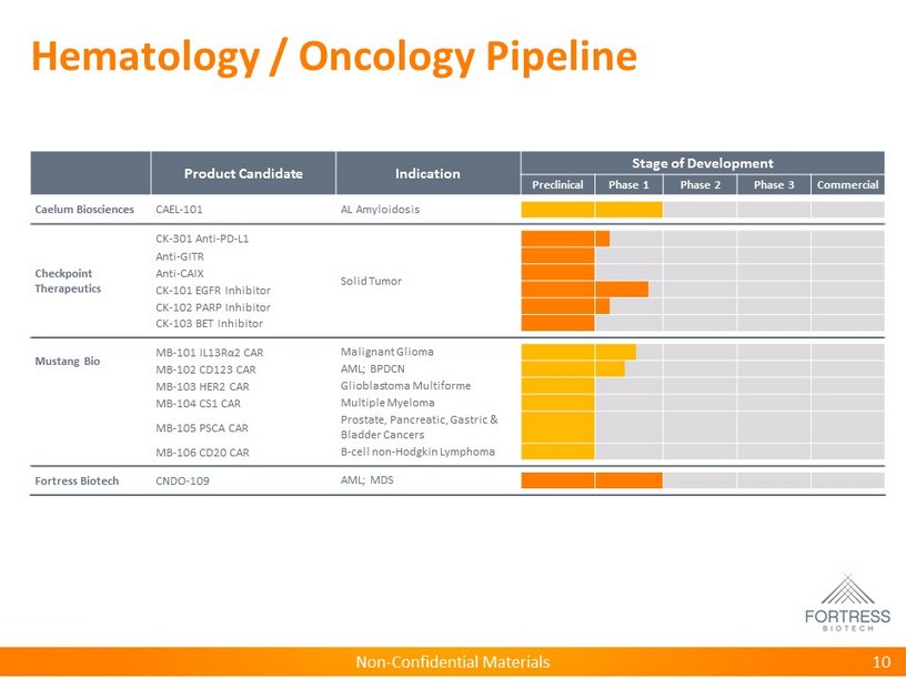 Non - Confidential Materials Hematology / Oncology Pipeline Product Candidate Indication Stage of Development Preclinical Phase 1 Phase 2 Phase 3 Commercial Caelum Biosciences CAEL - 101 AL Amyloidosis Checkpoint Therapeutics CK - 301 Anti - PD - L1 Solid Tumor Anti - GITR Anti - CAIX CK - 101 EGFR Inhibitor CK - 102 PARP Inhibitor CK - 103 BET Inhibitor Mustang Bio MB - 101 IL13R α 2 CAR Malignant Glioma MB - 102 CD123 CAR AML; BPDCN MB - 103 HER2 CAR Glioblastoma Multiforme MB - 104 CS1 CAR Multiple Myeloma MB - 105 PSCA CAR Prostate, Pancreatic, Gastric & Bladder Cancers MB - 106 CD20 CAR B - cell non - Hodgkin Lymphoma Fortress Biotech CNDO - 109 AML; MDS 10