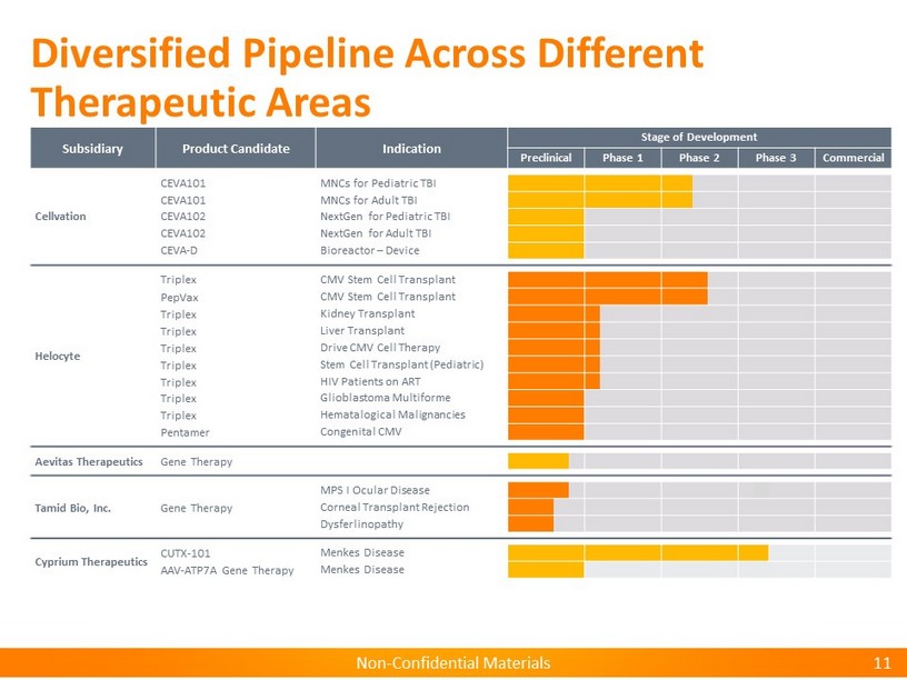 Non - Confidential Materials Non - Confidential Materials Diversified Pipeline Across Different Therapeutic Areas 11 Subsidiary Product Candidate Indication Stage of Development Preclinical Phase 1 Phase 2 Phase 3 Commercial Cellvation CEVA101 MNCs for Pediatric TBI CEVA101 MNCs for Adult TBI CEVA102 NextGen for Pediatric TBI CEVA102 NextGen for Adult TBI CEVA - D Bioreactor – Device Helocyte Triplex CMV Stem Cell Transplant PepVax CMV Stem Cell Transplant Triplex Kidney Transplant Triplex Liver Transplant Triplex Drive CMV Cell Therapy Triplex Stem Cell Transplant (Pediatric) Triplex HIV Patients on ART Triplex Glioblastoma Multiforme Triplex Hematalogical Malignancies Pentamer Congenital CMV Aevitas Therapeutics Gene Therapy Tamid Bio, Inc. Gene Therapy MPS I Ocular Disease Corneal Transplant Rejection Dysferlinopathy Cyprium Therapeutics CUTX - 101 Menkes Disease AAV - ATP7A Gene Therapy Menkes Disease