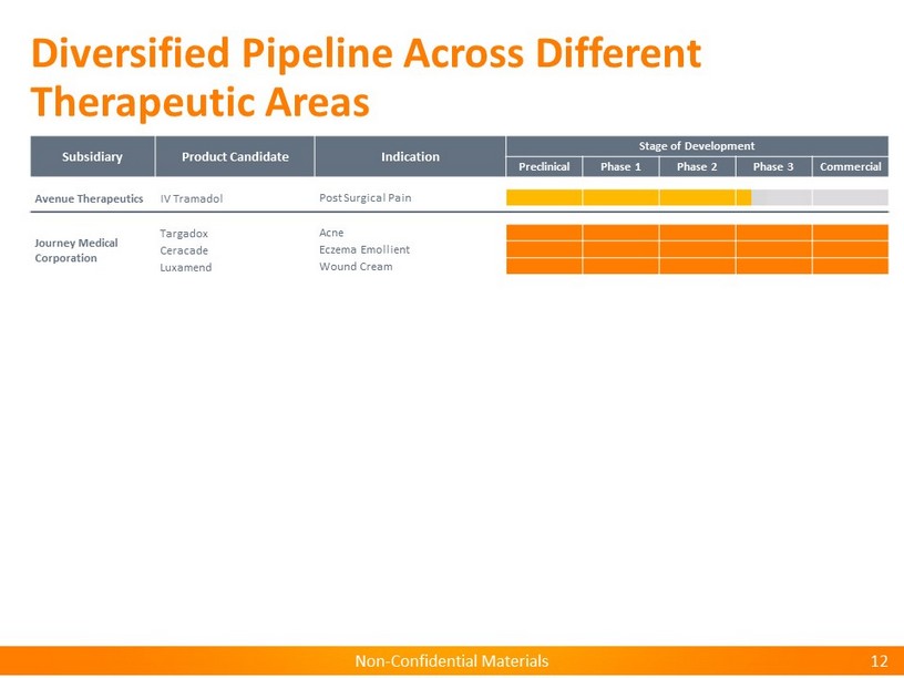 Non - Confidential Materials Non - Confidential Materials Diversified Pipeline Across Different Therapeutic Areas 12 Subsidiary Product Candidate Indication Stage of Development Preclinical Phase 1 Phase 2 Phase 3 Commercial Avenue Therapeutics IV Tramadol Post Surgical Pain Journey Medical Corporation Targadox Acne Ceracade Eczema Emollient Luxamend Wound Cream