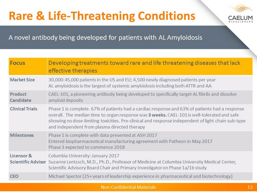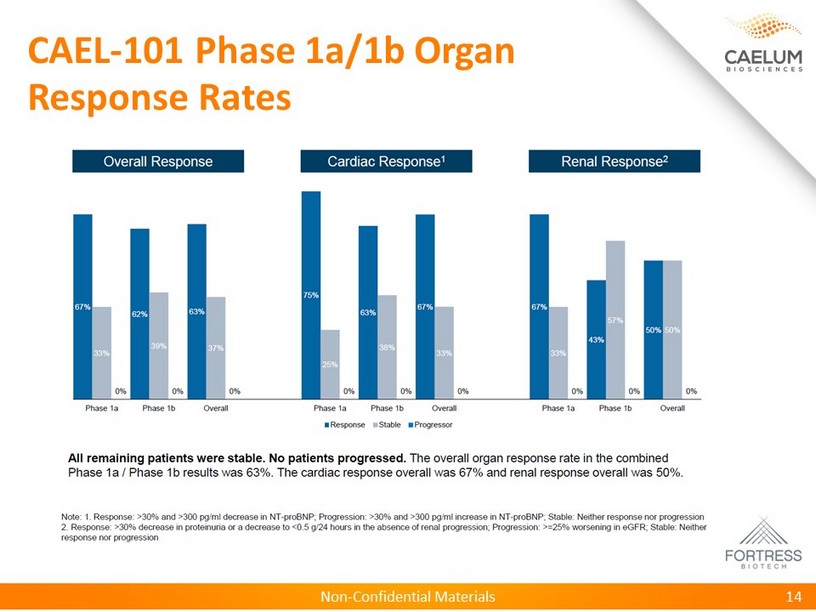Non - Confidential Materials Non - Confidential Materials 13 Focus Developing treatments toward rare and life threatening diseases that lack effective therapies Market Size 30,000 - 45,000 patients in the US and EU; 4,500 newly diagnosed patients per year AL amyloidosis is the largest of systemic amyloidosis including both ATTR and AA Product Candidate CAEL - 101, a pioneering antibody being developed to specifically target AL fibrils and dissolve amyloid deposits Clinical Trials Phase 1 is complete. 67% of patients had a cardiac response and 63% of patients had a response overall. The median time to organ response was 3 weeks. CAEL - 101 is well - tolerated and safe showing no dose - limiting toxicities. Pre - clinical and response independent of light chain sub - type and independent from plasma directed therapy Milestones Phase 1 is complete with data presented at ASH 2017 Entered biopharmaceutical manufacturing agreement with Patheon in May 2017 Phase 3 expected to commence 2018 Licensor & Scientific Advisor Columbia University: January 2017 Suzanne Lentzsch, M.D., Ph.D., Professor of Medicine at Columbia University Medical Center, Scientific Advisory Board Chair and Primary Investigator on Phase 1a/1b study CEO Michael Spector (25+ years of leadership experience in pharmaceutical and biotechnology) A novel antibody being developed for patients with AL Amyloidosis Rare & Life - Threatening Conditions