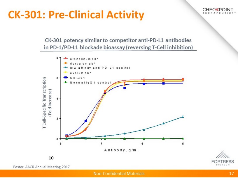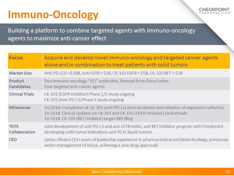 Non - Confidential Materials Non - Confidential Materials 16 Focus Acquire and develop novel immuno - oncology and targeted cancer agents alone and in combination to treat patients with solid tumors Market Size Anti - PD - (L)1 >$30B, Anti - GITR > $1B, CK - 101 EGFR > $5B, CK - 103 BET > $1B Product Candidates Two immuno - oncology “I/O” antibodies, licensed from Dana Farber Four targeted anti - cancer agents Clinical Trials CK - 101 (EGFR Inhibitor) Phase 1/2 study ongoing CK - 301 (Anti - PD - L1) Phase 1 study ongoing Milestones 1Q 2018: Completion of CK - 301 (anti - PD - L1) dose escalation and initiation of expansion cohort(s) 1H 2018: Clinical updates on CK - 301 and CK - 101 (EGFR Inhibitor) clinical trials 1H 2018: CK - 103 (BET Inhibitor) target IND filing TGTX Collaboration Joint development of anti - PD - L1 and anti - GITR mAbs, and BET inhibitor program with Checkpoint developing solid tumor indications and TG in liquid tumors CEO James Oliviero (15+ years of leadership experience in pharmaceutical and biotechnology, previously senior management of Keryx, achieving a new drug approval) Building a platform to combine targeted agents with immuno - oncology agents to maximize anti - cancer effect Immuno - Oncology