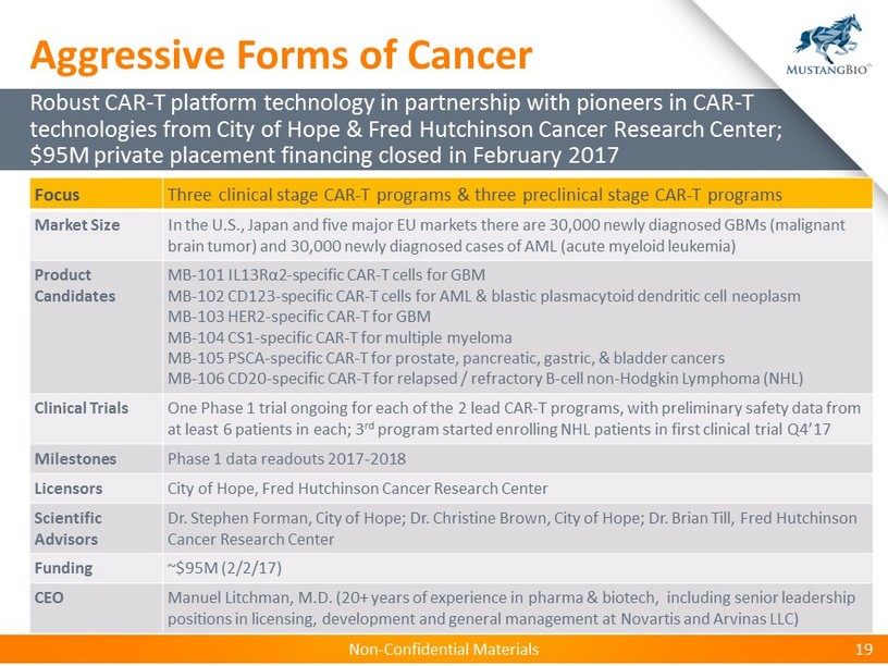 Non - Confidential Materials Non - Confidential Materials Focus Two lead CAR - T programs targeting IL13R α 2 and CD123, for the treatment of Glioblastoma Multiforme and AML/BPDCN, respectively Market Size In U.S., Japan and five major EU markets per year… ~30,000 newly diagnosed GBMs (malignant brain tumor) ~30,000 newly diagnosed cases of AML (acute myeloid leukemia) Product Candidates MB - 101 IL13R α 2 - specific CAR - T cells which have no current competition MB - 102 CD123 - specific CAR - T cells which have been validated in ultra orphan indication Clinical Trials Two Phase 1 trials ongoing with preliminary safety data from at least 6 patients in both CAR - T programs Milestones Phase 1 data readouts early 2018 NEJM case study demonstrates MB - 101 achieved complete remission in patient with recurrent GBM Licensor City of Hope Scientific Advisors Dr. Stephen Forman, City of Hope Dr. Christine Brown, City of Hope Focus Three clinical stage CAR - T programs & three preclinical stage CAR - T programs Market Size In the U.S., Japan and five major EU markets there are 30,000 newly diagnosed GBMs (malignant brain tumor) and 30,000 newly diagnosed cases of AML (acute myeloid leukemia) Product Candidates MB - 101 IL13R α 2 - specific CAR - T cells for GBM MB - 102 CD123 - specific CAR - T cells for AML & blastic plasmacytoid dendritic cell neoplasm MB - 103 HER2 - specific CAR - T for GBM MB - 104 CS1 - specific CAR - T for multiple myeloma MB - 105 PSCA - specific CAR - T for prostate, pancreatic, gastric, & bladder cancers MB - 106 CD20 - specific CAR - T for relapsed / refractory B - cell non - Hodgkin Lymphoma (NHL) Clinical Trials One Phase 1 trial ongoing for each of the 2 lead CAR - T programs, with preliminary safety data from at least 6 patients in each; 3 rd program started enrolling NHL patients in first clinical trial Q4’17 Milestones Phase 1 data readouts 2017 - 2018 Licensors City of Hope, Fred Hutchinson Cancer Research Center Scientific Advisors Dr. Stephen Forman, City of Hope; Dr. Christine Brown, City of Hope; Dr. Brian Till, Fred Hutchinson Cancer Research Center Funding ~$95M (2/2/17) CEO Manuel Litchman , M.D. (20+ years of experience in pharma & biotech , including senior leadership positions in licensing, development and general management at Novartis and Arvinas LLC) 19 Robust CAR - T platform technology in partnership with pioneers in CAR - T technologies from City of Hope & Fred Hutchinson Cancer Research Center; $95M private placement financing closed in February 2017 Aggressive Forms of Cancer
