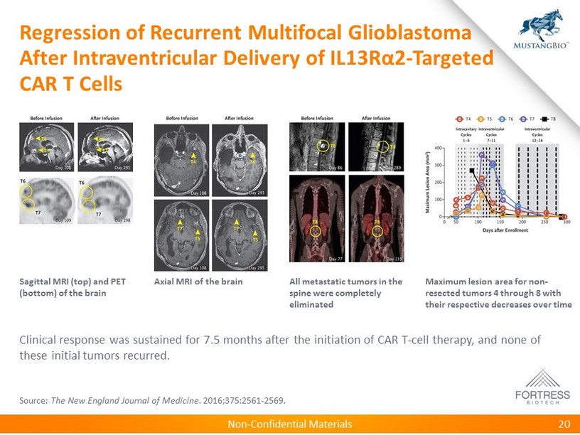 Non - Confidential Materials Regression of Recurrent Multifocal Glioblastoma After Intraventricular Delivery of IL13R α 2 - Targeted CAR T Cells 20 Sagittal MRI (top) and PET (bottom) of the brain Axial MRI of the brain All metastatic tumors in the spine were completely eliminated Maximum lesion area for non - resected tumors 4 through 8 with their respective decreases over time Clinical response was sustained for 7.5 months after the initiation of CAR T - cell therapy, and none of these initial tumors recurred. Source: The New England Journal of Medicine . 2016;375:2561 - 2569.