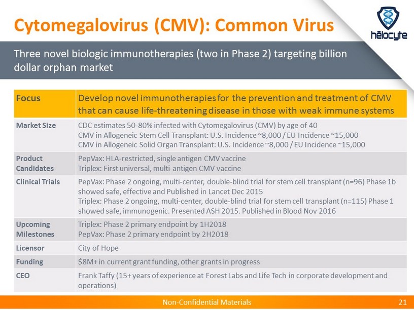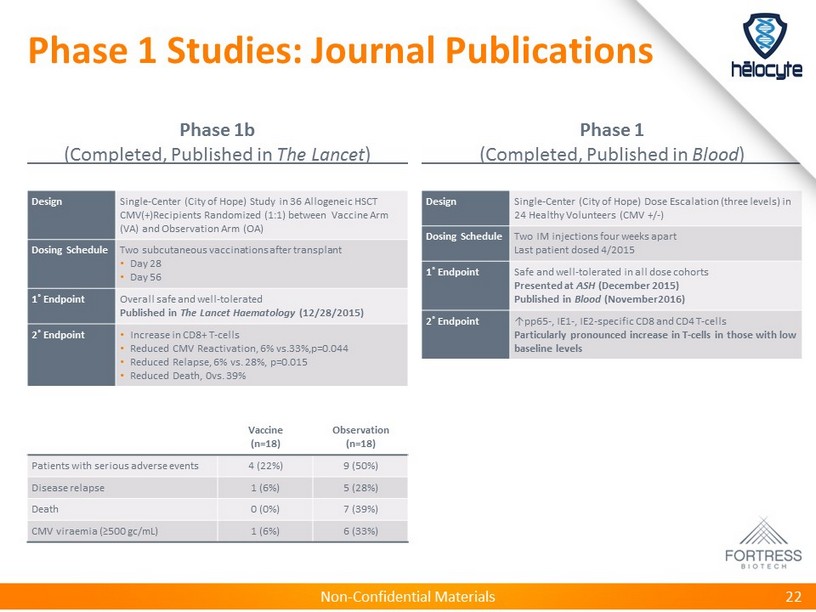 Non - Confidential Materials Non - Confidential Materials 21 Focus Develop novel immunotherapies for the prevention and treatment of CMV that can cause life - threatening disease in those with weak immune systems Market Size CDC estimates 50 - 80% infected with Cytomegalovirus (CMV) by age of 40 CMV in Allogeneic Stem Cell Transplant: U.S. Incidence ~8,000 / EU Incidence ~15,000 CMV in Allogeneic Solid Organ Transplant: U.S. Incidence ~8,000 / EU Incidence ~15,000 Product Candidates PepVax : HLA - restricted, single antigen CMV vaccine Triplex: First universal, multi - antigen CMV vaccine Clinical Trials PepVax : Phase 2 ongoing, multi - center, double - blind trial for stem cell transplant (n=96) Phase 1b showed safe, effective and Published in Lancet Dec 2015 Triplex: Phase 2 ongoing, multi - center, double - blind trial for stem cell transplant (n=115) Phase 1 showed safe, immunogenic. Presented ASH 2015. Published in Blood Nov 2016 Upcoming Milestones Triplex: Phase 2 primary endpoint by 1H2018 PepVax : Phase 2 primary endpoint by 2H2018 Licensor City of Hope Funding $8M+ in current grant funding, other grants in progress CEO Frank Taffy (15+ years of experience at Forest Labs and Life Tech in corporate development and operations) Three novel biologic immunotherapies (two in Phase 2) targeting billion dollar orphan market Cytomegalovirus (CMV): Common Virus