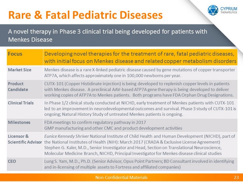 Proprietary Materials Non - Confidential Materials 23 Focus Developing novel therapies for the treatment of rare, fatal pediatric diseases, with initial focus on Menkes disease and related copper metabolism disorders Market Size Menkes disease is a rare X - linked pediatric disease caused by gene mutations of copper transporter ATP7A, which affects approximately one in 100,000 newborns per year. Product Candidate CUTX - 101 (Copper Histidinate injection) is being developed to replenish copper levels in patients with Menkes disease. A preclinical AAV - based ATP7A gene therapy is being developed to deliver working copies of ATP7A to Menkes patients. Both programs have FDA Orphan Drug Designations. Clinical Trials In Phase 1/2 clinical study conducted at NICHD, early treatment of Menkes patients with CUTX - 101 led to an improvement in neurodevelopmental outcomes and survival. Phase 3 study of CUTX - 101 is ongoing; Natural History Study of untreated Menkes patients is ongoing. Milestones FDA meetings to confirm regulatory pathway in 2017 GMP manufacturing and other CMC and product development activities Licensor & Scientific Advisor Eunice Kennedy Shriver National Institute of Child Health and Human Development (NICHD), part of the National Institutes of Health (NIH): March 2017 (CRADA & Exclusive License Agreement) Stephen G. Kaler, M.D., Senior Investigator and Head, Section on Translational Neuroscience, Molecular Medicine Branch, NICHD, Principal Investigator for Menkes disease clinical studies CEO Lung S. Yam, M.D., Ph.D. (Senior Advisor, Opus Point Partners; BD Consultant involved in identifying and in - licensing of multiple assets to Fortress and affiliated companies) A novel therapy in Phase 3 clinical trial being developed for patients with AL Menkes Disease Rare & Fatal Pediatric Diseases