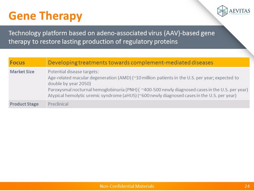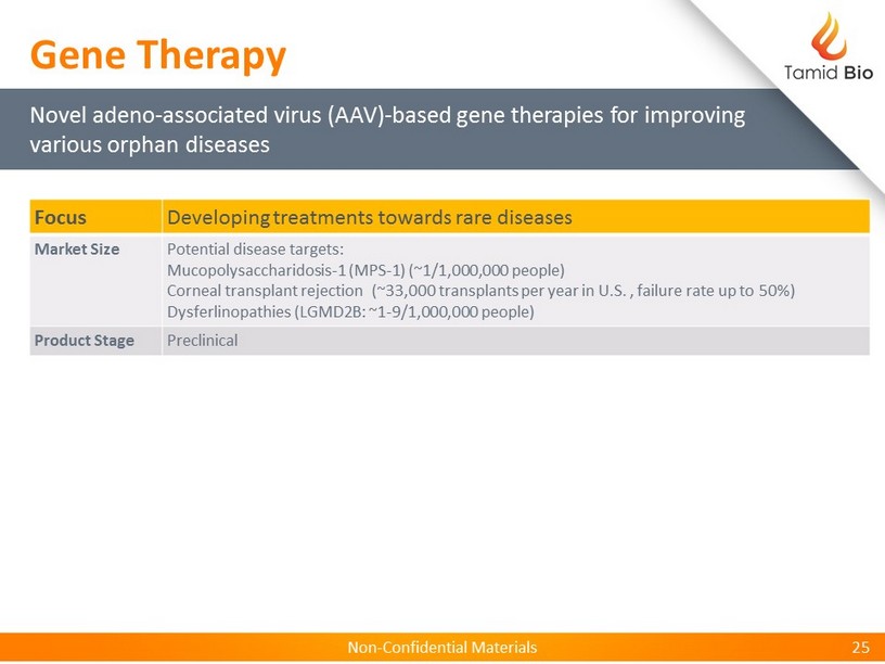 Proprietary Materials Non - Confidential Materials 24 Focus Developing treatments towards complement - mediated diseases Market Size Potential disease targets: Age - related macular degeneration (AMD) (~ 10 million patients in the U.S. per year; expected to double by year 2050 ) Paroxysmal nocturnal hemoglobinuria (PNH) ~ 400 - 500 newly diagnosed cases in the U.S. per year) A typical hemolytic uremic syndrome ( aHUS ) ( ~ 600 newly diagnosed cases in the U.S. per year) Product Stage Preclinical Technology platform based on adeno - associated virus (AAV) - based gene therapy to restore lasting production of regulatory proteins Gene Therapy