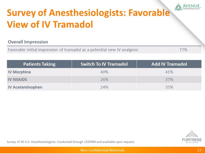 Non - Confidential Materials Survey of Anesthesiologists: Favorable View of IV Tramadol Survey of 30 U.S. Anesthesiologists. Conducted through LEERINK and available upon request. 27 Patients Taking Switch To IV Tramadol Add IV Tramadol IV Morphine 40% 41% IV NSAIDS 26% 37% IV Acetaminophen 24% 35% Overall Impression Favorable initial impression of t ramadol as a potential new IV analgesic 77%