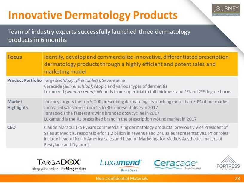 Non - Confidential Materials 28 Focus Identify, develop and commercialize innovative, differentiated prescription dermatology products through a highly efficient and potent sales and marketing model Product Portfolio Targadox ( doxycyline tablets ) : Sever e acne Ceracade (skin emulsion) : Atopic and various types of dermatitis Luxamend (wound cream) : Wounds from superficial to full thickness and 1 st and 2 nd degree burns Market Highlights Journey targets the top 5,000 prescribing dermatologists reaching more than 70% of our market Increased sales force from 15 to 30 representatives in 2017 Targadox is the fastest growing branded doxycycline in 2017 Luxamend is the #1 prescribed brand in the prescription wound market in 2017 CEO Claude Maraoui (25+ years commercializing dermatology products; previously Vice President of Sales at Medicis , responsible for 1.2 billion in revenue and 240 sales representatives. Prior roles include head of North America sales and head of Marketing for Medicis Aesthetics makers of Restylane and Dysport ) Team of industry experts successfully launched three dermatology products in 6 months Innovative Dermatology Products