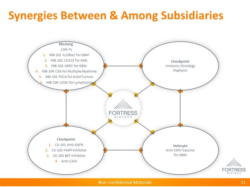 Non - Confidential Materials Checkpoint Immuno - Oncology Platform Helocyte Anti - CMV Vaccine for GBM Checkpoint 1. CK - 101 Anti - EGFR 2. CK - 102 PARP Inhibitor 3. CK - 103 BET Inhibitor 4. Anti - CAIX Mustang CAR - Ts 1. MB - 101 IL13R α 2 for GBM 2. MB - 102 CD123 for AML 3. MB - 103 HER2 for GBM 4. MB - 104 CSA for Multiple Myeloma 5. MB - 105 PSCA for Solid Tumors 6. MB - 106 CD20 for Lymphoma Synergies Between & Among Subsidiaries 31